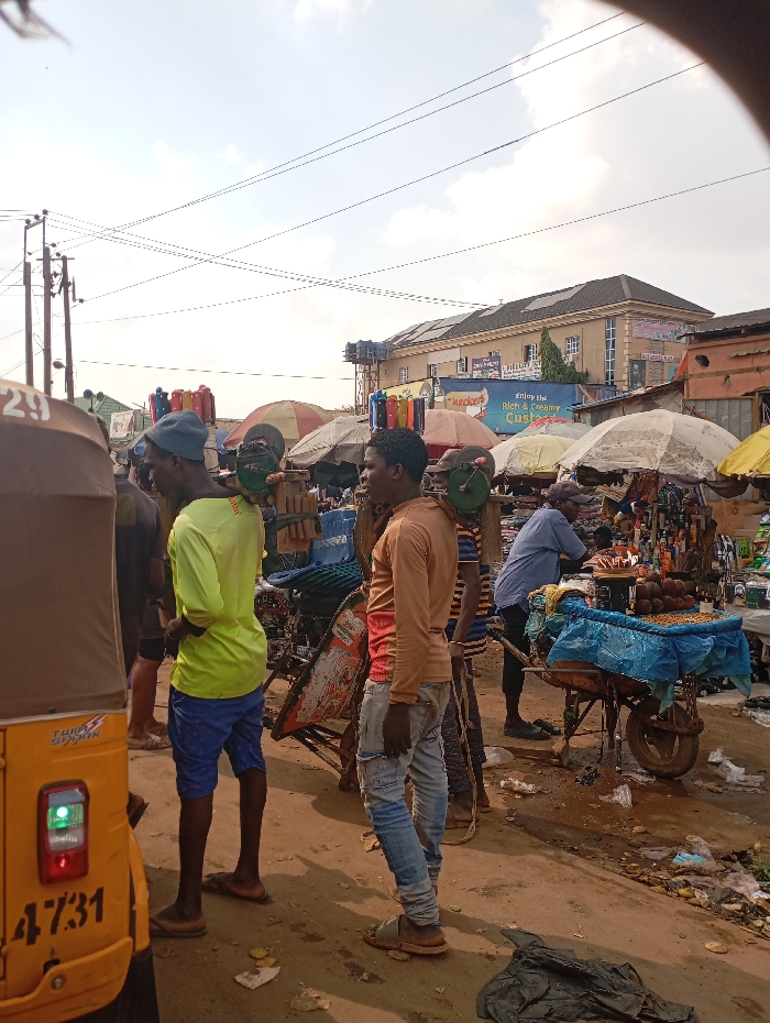 The image depicts a bustling outdoor market street in Katambe, Nigeria