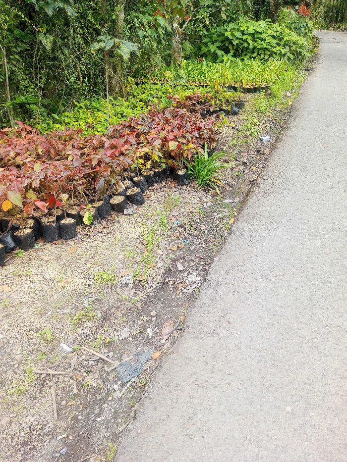 The image presents a ground-level view of a roadside scene in the city of Unknown, Vietnam. A light gray asphalt road occupies the right side of the frame, tapering into the distance. To its left, a dirt and gravel shoulder runs parallel, containing sparse green weeds, scattered dry leaves, small sticks, and a light-colored granular material covering portions of the ground. Along this shoulder, multiple rows of potted plants are displayed. The most prominent row features numerous small plants with reddish-brown and green variegated leaves, each contained within a black plastic grow bag. Behind these, additional plants with predominantly green foliage, also in black grow bags, extend further back. A singular plant with long, strap-like green leaves is visible in the dirt directly in front of the reddish-leaved plants. The far left background is dominated by dense, overgrown green foliage, including various trees and shrubs, indicative of a natural or semi-wild environment. No individuals, animals, or explicit actions are depicted.