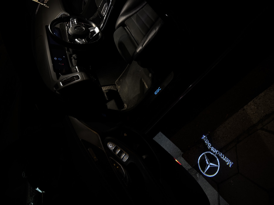 A dark interior view of a Mercedes-Benz EQC electric vehicle is captured at night, with the driver's side door ajar, illuminating the immediate exterior ground