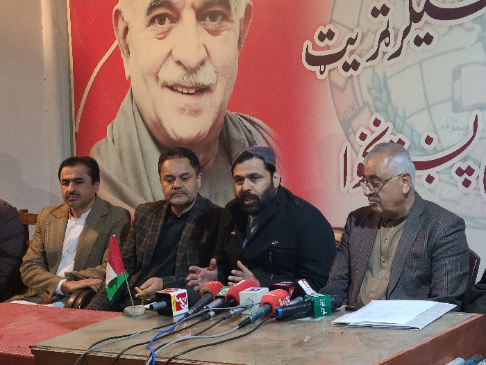 This image depicts an indoor scene in Quetta City Tehsil, Pakistan, likely a press conference or political gathering