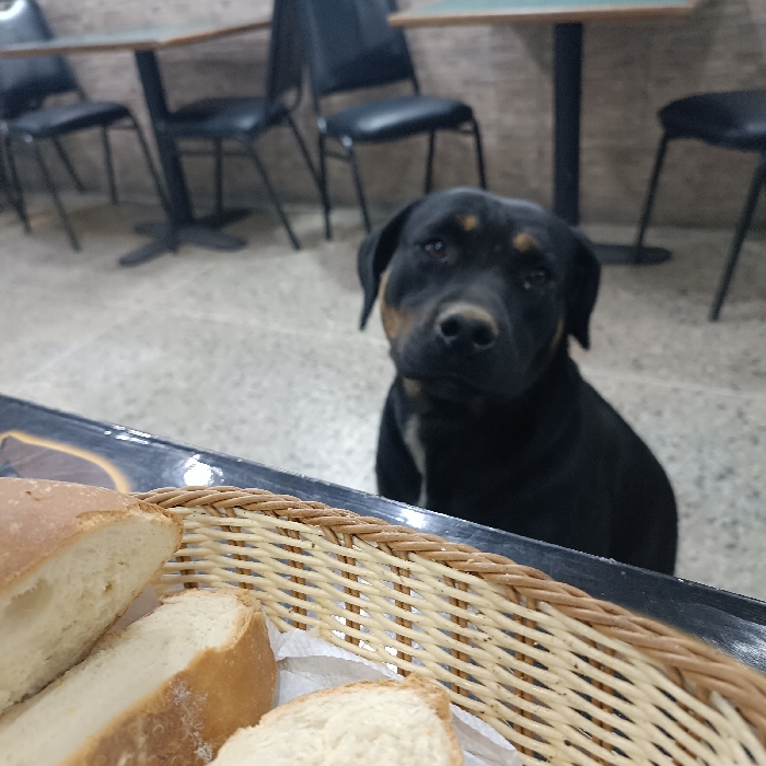 The scene is an interior view of what appears to be a public eating establishment, such as a cafe or restaurant, located in Los Teques, Venezuela. In the mid-ground, a black dog with tan markings on its muzzle, chest, and above its eyes, consistent with a Rottweiler-type breed, is positioned looking directly towards the camera with a focused expression. The dog's head is slightly tilted. In the foreground, a light-colored woven wicker basket rests on a dark counter or tabletop. The basket contains multiple slices of light-colored bread, likely from a baguette, resting on a white paper napkin partially visible beneath. The background is out of focus, revealing several empty tables with dark bases and light-colored tops, accompanied by dark chairs with black upholstered seats. The floor is light-colored, possibly tile or concrete, and the walls have a textured, light brown or beige finish. The dog appears to be observing the bread in the foreground or the camera's position relative to it.