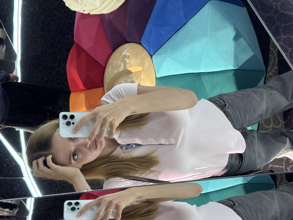 A female individual is depicted taking a mirror selfie in an indoor setting, likely a gallery or retail space, in Chuo, Japan. She is positioned slightly off-center, facing the camera directly with a neutral expression. Her right hand holds a light-colored smartphone towards the mirror, capturing the image. Her left hand is placed on top of her head, with fingers splayed. She has light brown, long hair, a light pink polo shirt with a blue-buttoned placket, and dark gray jeans. Silver-colored rings are visible on both ring fingers. A faint tattoo is on her inner right forearm. The environment features mirrored walls, reflecting the subject and parts of a dark, patterned floor. To the right and behind the subject is a large, colorful, geometric sculpture or seating arrangement resembling a flower. This object consists of multiple polygonal sections upholstered in bright hues including red, orange, purple, blue, teal, and light blue, surrounding a lighter wooden or beige central element. Partial reflections of other individuals, dressed in dark clothing, are visible in the mirrored background.