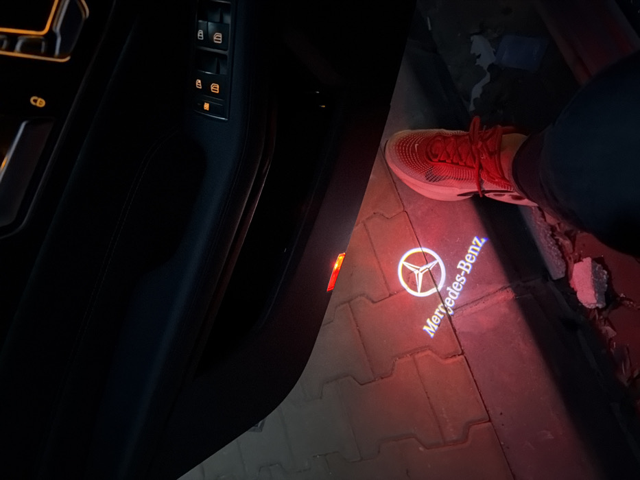 An open vehicle door reveals a dark interior with illuminated orange window and lock controls. A red rectangular light is visible on the lower door panel. A bright white Mercedes-Benz logo and text are projected onto a paved surface, illuminating it with a reddish glow. A human foot, wearing a red and white sneaker and dark pants, is positioned near the projected logo, partially obstructing it. The ground consists of interlocking pavers with some small debris present. The scene takes place in a low-light environment in Rudozem, Bulgaria.