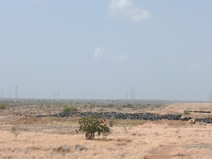 The image displays an expansive, arid landscape under a pale blue sky in La Guardia, Venezuela. The foreground is dominated by dry, tan-colored grasses, featuring a small, green-leafed tree slightly left of center and a smaller, bare tree to its left. The midground reveals a large, dark pile composed of numerous discarded black vehicle tires, extending horizontally across the frame. To the right of this tire accumulation, an earthen berm is visible, with a single yellow tire or similar object positioned near its base. The distant background horizon shows a flatter terrain with multiple metal lattice transmission towers, indicating power infrastructure. No human or animal subjects are present. The scene depicts a significant accumulation of waste tires within a dry, open environment marked by power lines.