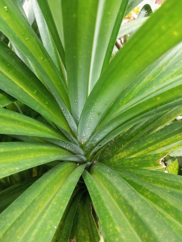 A close-up, high-angle view depicts the central foliage of a vibrant green plant, situated in the city of Pandaria, India