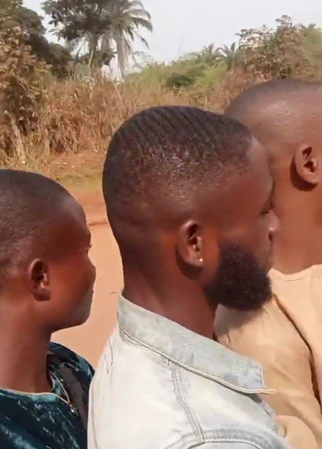 Three people are seated on what appears to be a motorcycle or similar small vehicle, moving along a dirt road