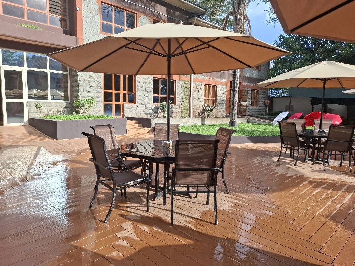 The scene is an outdoor patio located at coordinates -0.754, 36.438 in the city of Karagita, Kenya. The patio is constructed of brown wood planks and features a large brown umbrella. There are four black metal chairs surrounding a black metal table with a brown tabletop. Four other black metal chairs are visible in the background around a separate black metal table. The patio is adjacent to a building with a stone exterior and multiple windows. The ground is wet, suggesting recent rainfall. Green foliage is visible around the patio. There are no people visible in the image.