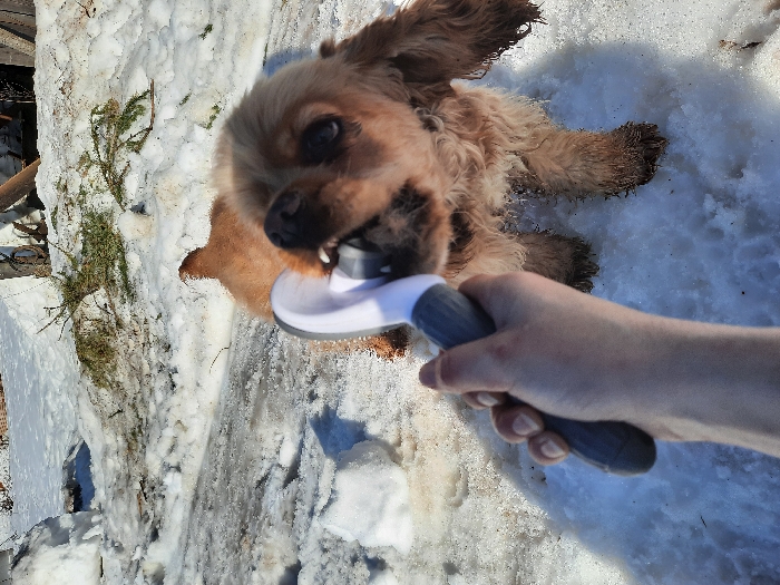 - "An outdoor scene in Krasnogorskoye, Russia, depicts a light brown or tan long-haired dog, consistent with a Cocker Spaniel, interacting with a grooming tool on snow-covered ground" by FM-ezn9Z2, licensed under CC BY 4.0