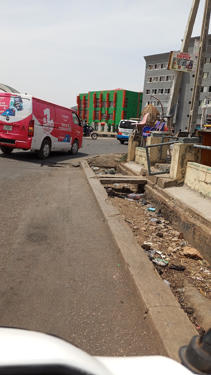 This image depicts an urban street scene in what is identified as the city of Sardauna, Nigeria, under a clear, bright sky. The foreground shows a segment of an asphalt road and a concrete curb separating it from an open drainage ditch. The ditch is largely dry and filled with various debris, including plastic wrappers, dirt, and rocks. A small concrete slab bridges a portion of the ditch. On the road, a red and white branded utility van, appearing to be a Toyota Hiace, is prominent. It features "Colgate" branding, a large "1" graphic, and a political campaign image of Bola Ahmed Tinubu with text in what appears to be a local language. The license plate "LSD-326 YH" is visible on the rear. Further down the road, a white and blue minibus is partially visible, and a lone motorcyclist is seen in motion. To the right of the road, beyond the drainage ditch, a raised concrete platform or sidewalk area displays various chairs for sale, including a brown wicker hanging egg chair, a pink plastic chair, a blue plastic chair, and a black office-style chair. Behind this display, a tall utility pole supports a rectangular sign advertising "CEMENT DEPOT." In the background, multiple multi-story buildings are visible. A prominent structure on the left features a distinctive green exterior with orange trim. To its right, a gray multi-story building with numerous windows is observed. The overall environment suggests a bustling commercial area with ongoing vehicular traffic and retail activity.