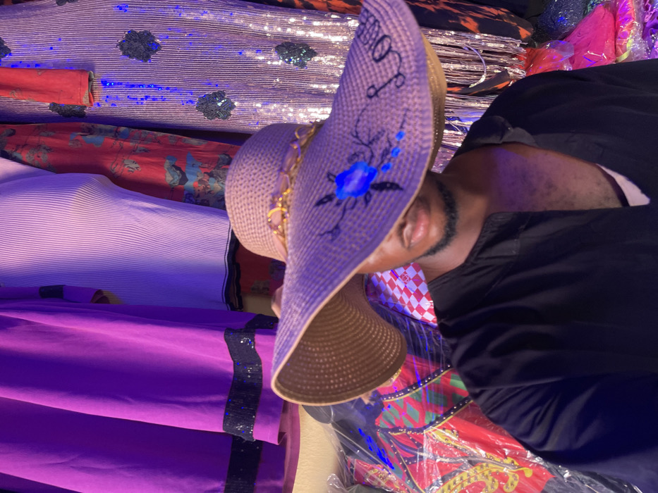A male individual with dark skin and a short beard is depicted in a retail setting in Samaru, Nigeria. He wears a dark, collarless V-neck garment and holds a large, light-brown, wide-brimmed straw hat in front of his face, obscuring his eyes and forehead. The hat features a gold-colored braided band around the crown and a painted design on the brim consisting of a blue floral shape and the word "Love" in black script. The background is a display of various clothing items, including a purple garment with a black sequined hem, a light-colored ribbed top, a red patterned fabric, and a silver sequined garment with dark patterns. Other packaged merchandise is visible below. The scene is illuminated with prominent purple and blue artificial lighting.