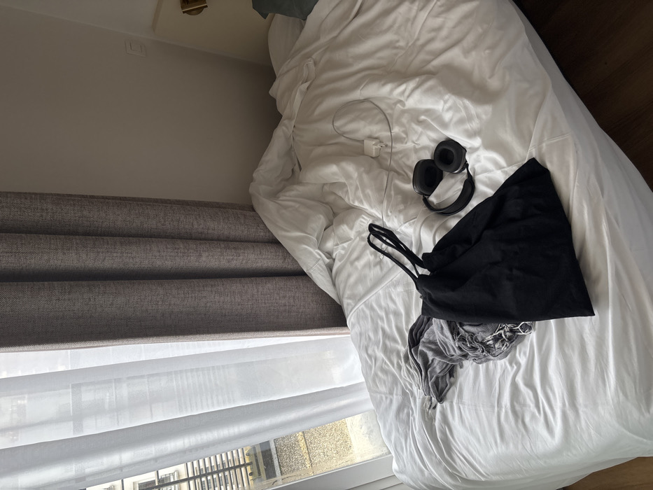The image depicts an unmade bed in an indoor setting, likely a room within Asnières-sur-Seine, France. The bed is covered in white sheets and a duvet, occupying the central and right portions of the frame. On the left side of the bed, a crumpled grey scarf or garment featuring metallic chain-link elements is present, alongside a black fabric tote bag with two visible straps. To the right of these items, a pair of black over-ear headphones rests on the bedding, positioned near a white phone charger consisting of a wall adapter and a coiled cable. The bed is situated against a light-colored wall, with a partial light brown or golden headboard visible on the far right, and a fragment of a teal-colored pillow. To the left of the bed, a window is partially covered by a sheer white inner curtain and a textured brown/taupe outer curtain, the latter partially drawn. Through the window, a dark-colored metal balcony railing is visible, with blurred architectural elements and a yellowish, possibly reflective exterior surface beyond. A white light switch is mounted on the wall above the bed, to the right of the curtains. A section of dark brown wooden or laminate flooring is visible in the lower right corner of the scene. No individuals are present.