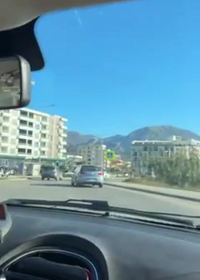 A car is driving down a road in a town, on a clear, sunny day. There are buildings on both sides of the road, and mountains in the background. Other cars are on the road, and there is a crosswalk sign visible. The windshield of the car filming is a little dirty. The sky is clear blue.
