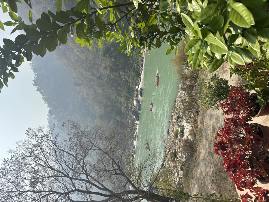 This image presents a wide river scene in Jonk, India, observed from a slightly elevated vantage point. The foreground contains several potted plants with distinctive red foliage, positioned on a dirt ground surface, alongside other green foliage from bushes and a large, bare-branched tree framing the left side of the frame. The river, characterized by its prominent turquoise-green coloration, flows from the upper left towards the lower right. Its immediate banks are composed of sandy and rocky terrain, sparsely covered with small green bushes. Three red inflatable rafts are visible on the water, spaced along the river's course. Each raft contains multiple individuals, engaged in what appears to be recreational rafting. Near the middle raft, a person is partially submerged in the water. The background reveals a series of distant hills and mountains, heavily forested with green trees, appearing hazy due to atmospheric conditions. The sky above is pale and shows no distinct cloud formations.
