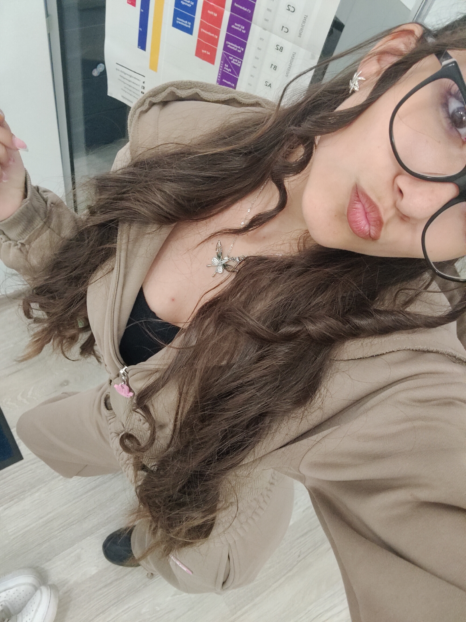 A young woman is captured in a high-angle selfie indoors. She possesses long, wavy dark brown hair, wears black-rimmed glasses, and has her lips slightly pursed with pinkish-red lipstick. A silver leaf-shaped earring adorns her left ear. She is dressed in a light tan or beige hooded tracksuit, unzipped to reveal a black bra or camisole. A silver chain necklace with a prominent butterfly pendant rests on her chest, and a small pink charm is attached to the jacket's zipper pull. Partially visible on the left are her fingers, which have light pink nail polish, and a white sneaker. A dark shoe is partially visible on her other foot. The background features a light-colored plank floor and a white wall displaying several vertically oriented posters or charts. Text visible on these posters includes "ПЛОВДИВ" (Plovdiv), "БИЗНЕС" (Business), and "КОМЕРС" (Commerce), indicating the scene is located within a commercial, educational, or administrative building in Plovdiv, Bulgaria.