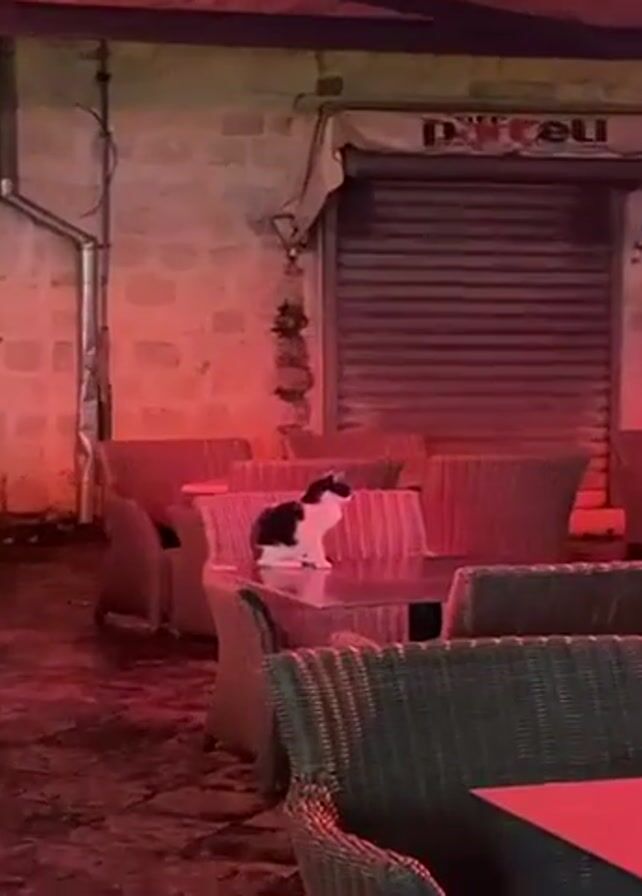An empty outdoor cafe is illuminated with red light. Wicker chairs surround tables with reflective surfaces. A black and white cat sits on one of the tables, facing the camera. Its eyes glow turquoise. The cat is still and staring.