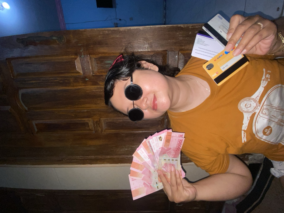 The image displays an adult female in an indoor setting in Gelam, Indonesia. She wears an orange short-sleeved t-shirt featuring a white graphic print of a scooter with the number "AB 70874," round dark-tinted sunglasses, and a red accessory in her dark hair. Her left hand holds a fanned stack of approximately ten 100,000 Indonesian Rupiah banknotes. Her right hand displays four plastic cards, fanned out, including a yellow card bearing a "BNI" logo and two silver-backed cards. The woman exhibits a slight upward gaze and a subtle smile. Behind her is a dark brown wooden door with vertical panels and a faint decorative carving on the upper right panel. To the left of the door, a light-colored wall is visible. To the right of the door, a room with blue-painted walls is visible, illuminated by a ceiling light, and features a dark rectangular object mounted on the wall.