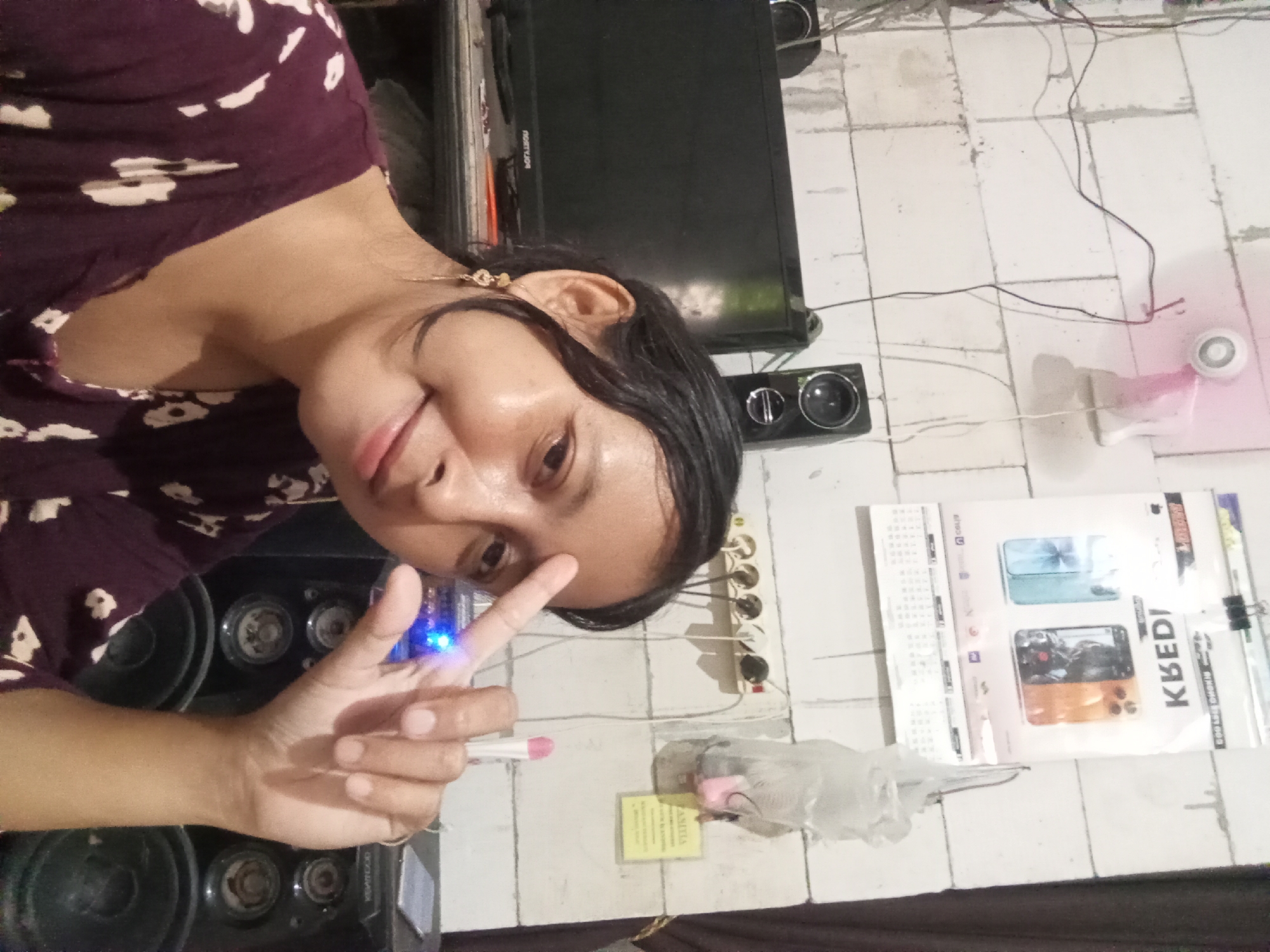 A young woman with dark hair and brown skin poses indoors, holding a lipstick in one hand and making a peace sign with the other. Behind her are a television set, speakers, and an electrical outlet strip. A calendar hangs on the tiled wall, and a small yellow sign is also visible. The location is potentially in Baron, Indonesia.