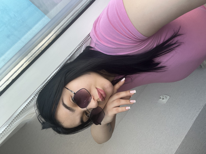 A female individual is depicted in an indoor setting, posing for a close-up photograph. She has dark hair, dark-tinted hexagonal sunglasses (the left lens shows a visible scratch), and is wearing a pink short-sleeved top. Her right hand, adorned with light pink nails featuring white tips (French manicure), is raised with fingers splayed near her temple. The background reveals a light-colored ceiling with a white two-pronged electrical outlet visible in the upper left quadrant. A white window frame runs vertically along the right side of the image, with the window glass reflecting a light blue color. The specific location within the city of Chaikovsky, Russia, cannot be determined from the visual information provided.