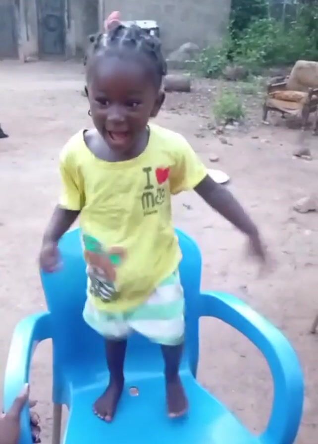 A young, dark-skinned girl with her hair in braids stands on a blue plastic chair outdoors. She wears a yellow t-shirt with a teddy bear on it and white shorts with green trim. She's barefoot. She extends her arms out and then turns her head to the side. A hand is visible near the left edge of the frame holding the chair steady. A building, a fence, and a second chair are visible in the background. The ground is dirt.