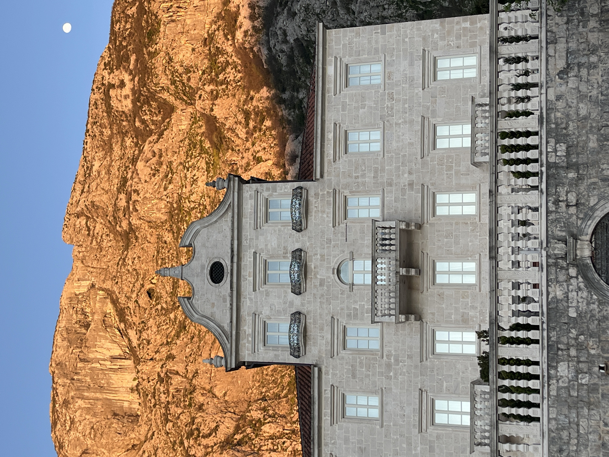 The image depicts a stone building situated in Dobrota, Montenegro. The building is multi-story with multiple windows and small balconies on the second and third floors. An ornate balcony is present on the third floor. Adjacent to the building is a rugged, rocky mountain illuminated by golden light, possibly from the setting sun. Above the mountain, in the clear sky, is the moon. A section of a stone wall and possible architectural structure featuring greenery is to the right of the building. The photograph is rotated, causing the building to appear on its side.