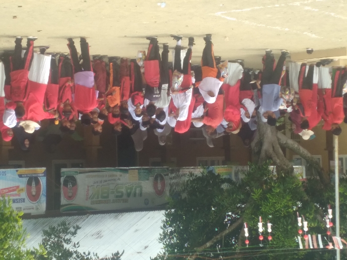 The image captures an outdoor gathering of approximately 40-50 individuals, primarily children with some adults, within a schoolyard in Keude Cunda, Indonesia