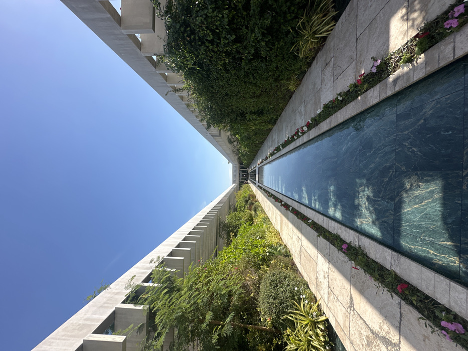 This image depicts an outdoor architectural and landscape feature at the Museum of Islamic Art (MIA) in Doha, Qatar. The scene presents a long, symmetrical pathway flanked by two parallel, light-colored concrete structures with repetitive open-frame elements underneath, suggesting covered walkways. A central, elongated reflecting pool runs the entire visible length of the path. The pool's base is composed of large, dark green marble tiles with lighter veining, through which clear water reflects a brilliant blue sky and fragments of the surrounding environment. On either side of the reflecting pool are narrow beds containing small, colorful flowers (predominantly pink, red, and white), bordering light-colored, rectangular tiled walkways. Beyond these walkways, lush and diverse green vegetation, including various trees, shrubs, and groundcover, thrives under the concrete structures and along the perimeter. The sky above is clear and bright blue. Natural sunlight illuminates the scene, casting distinct shadows from the overhead structures and plants onto the tiled paths. No individuals or animals are present within the frame, and no specific actions or interactions are depicted. The perspective extends deeply into the background, where another building structure is faintly visible at the far end of the corridor.