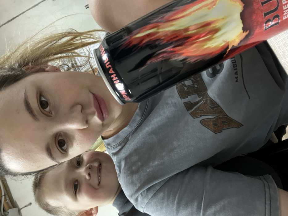 A woman holds a can of "Burn" energy drink in front of her. A young boy is next to her. The woman has brown eyes and light brown hair. The boy is fair-skinned with blonde hair and a smile. Both are wearing gray t-shirts. The woman's shirt has a "Bake" logo on it and a "Maison" caption above the logo. The background appears to be a room with a white wall.