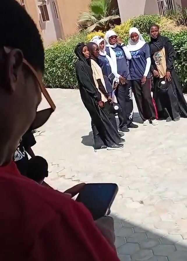 The scene shows a group of women posing for a photo in an outdoor setting. There are six women in the group; they are dressed in a mix of casual clothing and traditional Islamic attire, including hijabs and abayas. Some are holding white objects, possibly balls or similar items. The group is standing on a paved area in front of a building with light-colored walls. Green shrubbery is visible in the background, partially obscuring the building's features. To the left of the frame, a person wearing a white mask is seen. Closer to the camera, another person, wearing a red shirt, is seated and holding a smartphone, presumably taking photos or videos of the group. The overall environment suggests a sunny day in a courtyard or similar outdoor space.