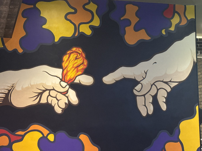 A mural depicts a playful take on Michelangelo's "The Creation of Adam." Two hands, one holding a golden-orange fried chicken wing, reach towards each other against a dark blue background. Abstract shapes of yellow, orange, purple, and brown surround the hands, mimicking the original artwork's celestial backdrop. The hands are illustrated with bold outlines, creating a cartoonish yet recognizable interpretation of the Renaissance masterpiece.