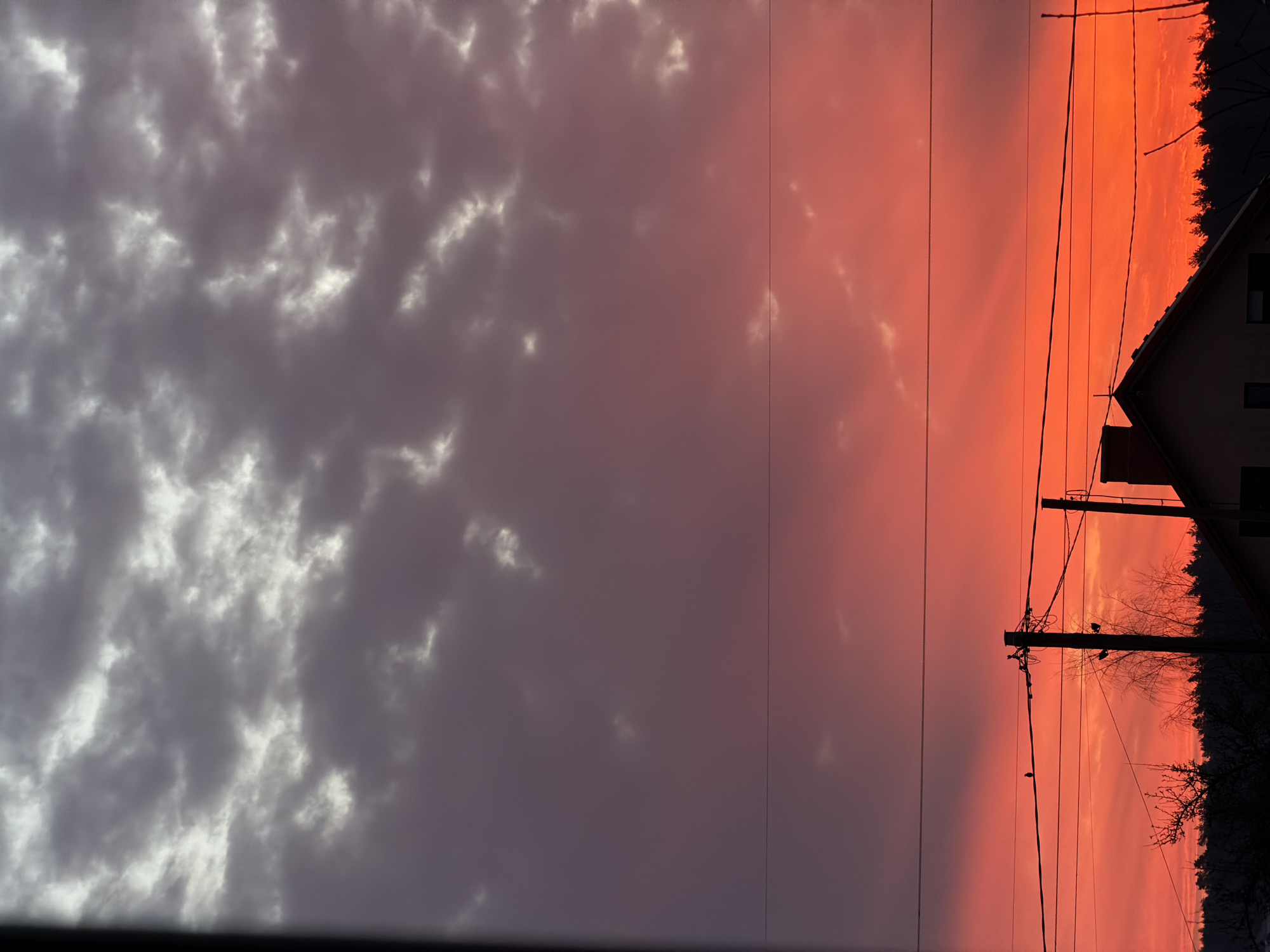 The image depicts an outdoor scene in Dreiliņi, Latvia, during either sunrise or sunset. The sky, occupying the majority of the frame, displays a vertical gradient of color, transitioning from dark grey and white clouds in the uppermost section to purples, magentas, and finally an intense, vibrant orange-red hue towards the horizon. Faint crepuscular rays are visible originating from the lower right within the orange-red sky. In the lower portion of the image, silhouetted against the bright sky, are multiple horizontal overhead utility lines. A single small bird is perched on one of these lines, positioned to the left of a prominent dark utility pole. The utility pole, equipped with several crossarms and insulators, stands slightly left of the image's vertical center, supporting numerous wires. Below the utility lines and around the pole, the dark silhouettes of bare tree branches are visible. The upper portion of a building, specifically a gabled roof and a chimney, is silhouetted in the lower right quadrant. A dense, dark line of trees forms the horizon line, extending across the bottom of the frame. No human subjects or discernible human activity are present.