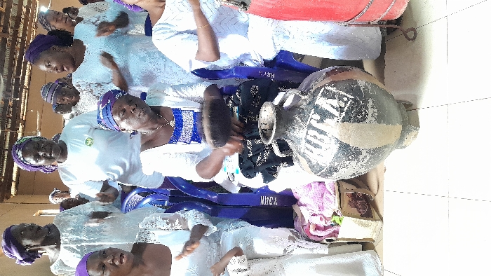 This image depicts an indoor gathering of approximately eight adult women in Akwanga, Nigeria