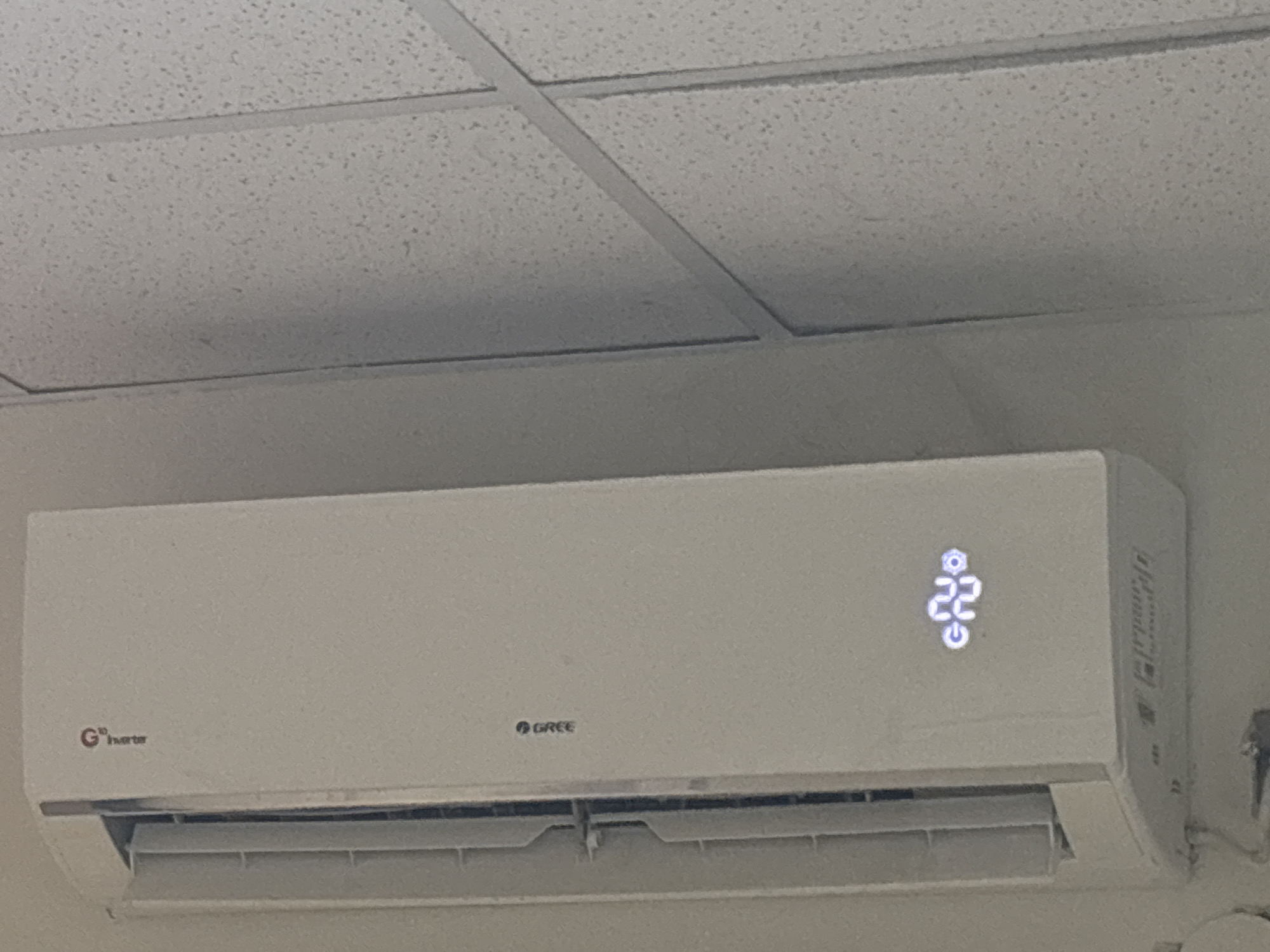 A white GREE GD Inverter split-type air conditioning unit is mounted on a light-colored wall in a room located in Rousso, Greece. The unit's digital display illuminates "22," indicating the temperature setting, accompanied by an active gear or snowflake icon above and a power symbol below. The air outlet louver at the bottom of the unit is open. Above the air conditioner, a white suspended acoustic tile ceiling with a visible grey metal grid system is present. No individuals or specific actions are depicted.