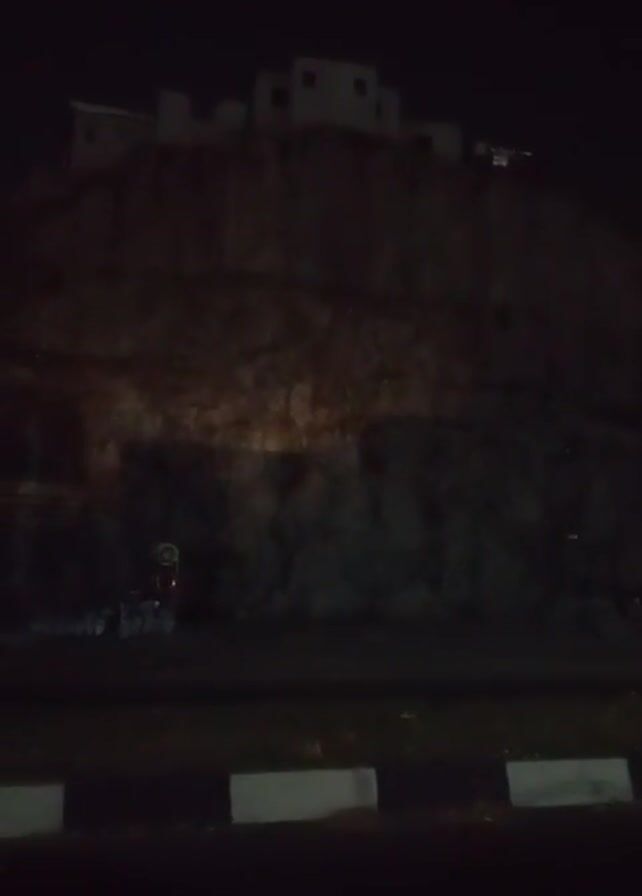 building sitting atop a rock formation at night. The building is illuminated, while the lower part of the rock formation is partially lit by headlights. In the foreground, a curb and road are visible. The overall scene appears dark and somewhat mysterious.