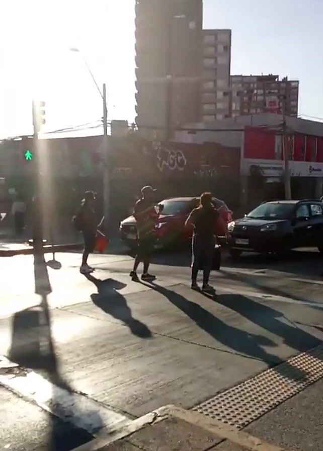 three people performing music in the middle of a crosswalk during a green light. They are beating on large, orange buckets with what appears to be drumsticks. All three people are silhouetted by the sun directly behind them, leaving only their general shapes visible. They are standing at a four-way intersection with cars lined up on two of the streets. A building is visible in the background, covered in graffiti on one side and painted red on the other. The sidewalk in the foreground is made of gray and beige stone tiles. The overall tone of the video is bright due to the sun, but the composition creates a focus on the musical performance.