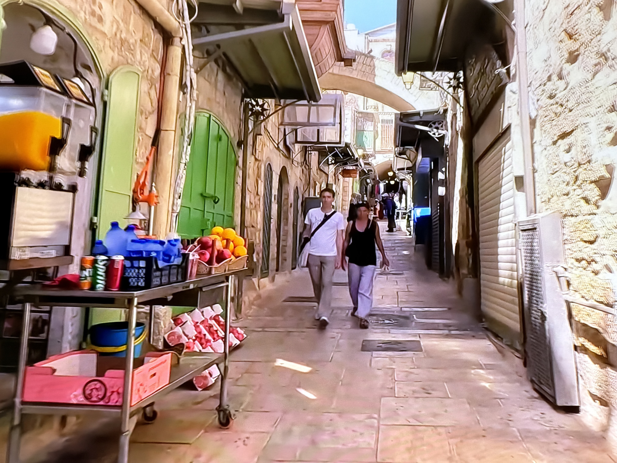 This image depicts a narrow, stone-paved alleyway in Lelystad, Netherlands. In the immediate left foreground, a stainless steel rolling cart serves as a market stall. Its upper shelf holds a clear orange juice dispenser, several blue plastic containers, a black crate, various beverage cans (including Sprite), and a wicker basket filled with fresh produce, primarily oranges and red fruit. The lower shelf contains multiple pink cardboard boxes, some holding white-wrapped items marked with red, and a blue bucket with a yellow rim. Two individuals are positioned in the mid-ground, walking towards the viewer. The person on the left is a male wearing a white t-shirt, light-colored trousers, and a dark shoulder bag. The person on the right is a female dressed in a dark tank top and light-colored trousers. Both walk with their arms at their sides. Several other indistinct figures are visible further down the alley. The architecture lining the alley consists of stone buildings. On the left, a facade features a large arched opening with light green wooden doors. On the right, a textured stone wall includes a closed, corrugated metal roller shutter. Overhead awnings extend from both sides. An arched stone structure spans the alley in the background, connecting buildings at a higher elevation. The ground is paved with irregularly shaped light-colored stones, illuminated by natural daylight which casts distinct patches of sunlight and shadow.
