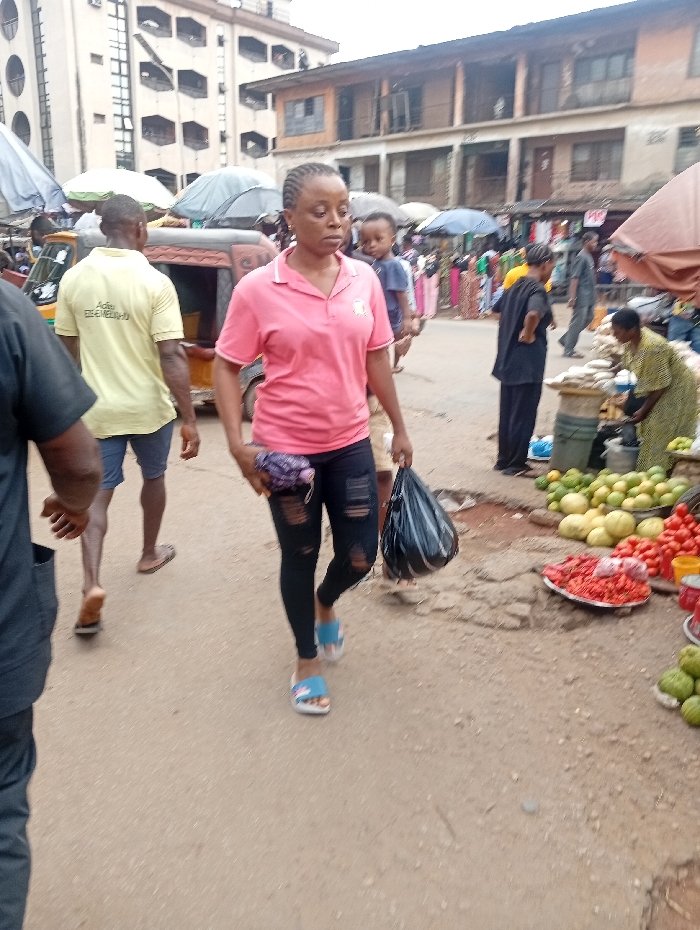 The image depicts a bustling street market scene in Onitsha, Nigeria. A woman, centrally positioned, walks towards the right side of the frame, wearing a pink polo shirt, black ripped jeans with visible distressed areas, and blue-and-white slide sandals. She carries a purple patterned clutch purse in her left hand and a black plastic bag in her right. Her hair is styled in braids. Behind her, a small child in a blue shirt is partially visible. To the woman's immediate left, a male subject in a light yellow polo shirt with "Ades... EZIEWE...D" text on the back walks away from the camera, wearing shorts and flip-flops. A portion of a dark-clad individual is visible in the extreme foreground on the left. On the right side of the unpaved, dusty street, a market stall displays various fresh produce directly on the ground or on mats. Piles of green and yellow melons or watermelons, bright red tomatoes, and red peppers are prominent. A female vendor, dressed in a patterned light yellow and black garment, attends to this stall. In the background, several other individuals navigate the market. A yellow and black tricycle (keke Napep) is partially visible behind the man in the yellow shirt. The street is lined with multi-story buildings, including a taller, light-colored structure and an older, brown two-story building with multiple windows and balconies, indicative of commercial or residential use. Several market umbrellas or canopies provide shade over various stalls throughout the background. The ground is uneven, showing signs of wear and minor cracks.