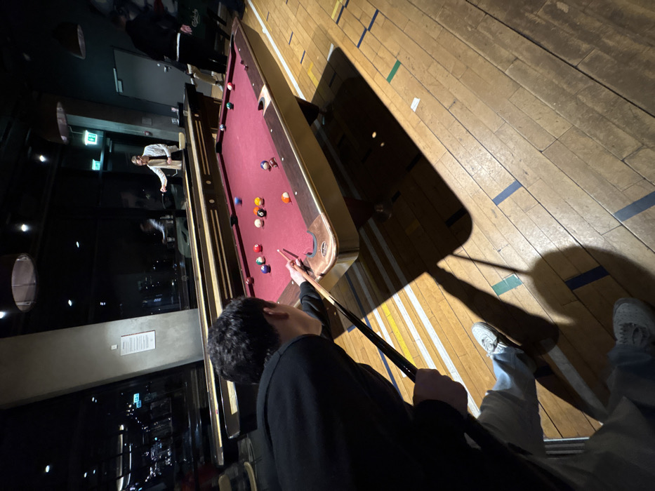 A person in a black shirt and jeans plays pool on a burgundy table with several colored balls. The table sits on a wooden floor marked with colored stripes. The scene is indoors with a view of a lit bar or restaurant in the background through glass doors or windows. The lighting is a mix of artificial and natural, casting a long shadow from the person playing pool.