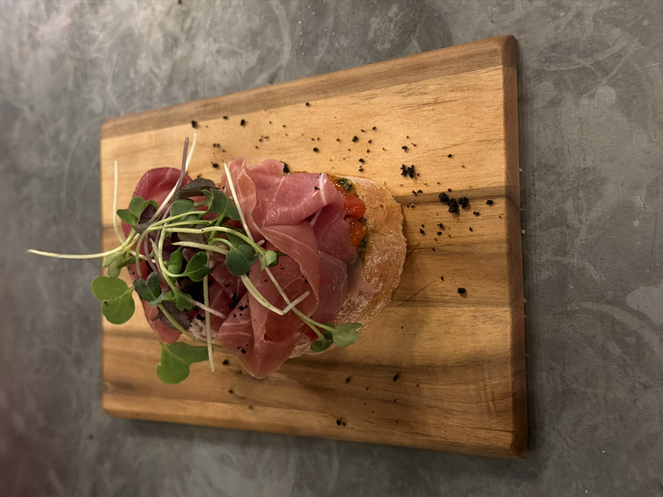 A single piece of bruschetta is centered on a light brown rectangular wooden serving board, which rests on a dark grey, subtly textured surface. The bruschetta consists of a thick slice of toasted white bread, topped with a layer of green spread (likely pesto), underneath diced red elements (consistent with sun-dried tomatoes or bell peppers). Several folds of thinly sliced, light pink cured ham, resembling prosciutto, are layered above. The uppermost garnish is a prominent cluster of vibrant green and reddish microgreens. Scattered across the wooden board around the bruschetta are small, dark, granular specks. No individuals or active subjects are present in the image. This scene is situated in Tallinn, Estonia.