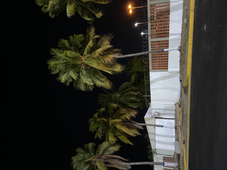 Palm trees line a building at night. The building is white with a red-brick upper section. A yellow line marks the edge of a dark-colored road or pavement next to the building. Streetlights illuminate the scene. The trees appear to grow between the building and the pavement. Barbed wire runs along the top of the building.