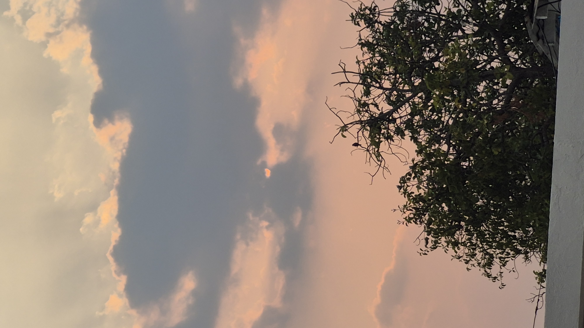 The image depicts an outdoor scene in Tinaquillo, Venezuela, captured during late afternoon or early evening. The upper two-thirds of the frame are dominated by a sky displaying a gradient of soft orange, pink, and light yellow hues. Scattered cumulus clouds are present, with darker grey formations at mid-level and thinner, illuminated clouds exhibiting orange and pink edges. A bright, crescent-shaped celestial body, likely the setting or rising sun, is partially visible through a gap in the clouds in the upper-left quadrant. The lower third of the image features the upper portion of a deciduous tree, occupying the right and central areas. Its lower branches are densely covered with dark green leaves, while numerous bare, brown branches extend upwards and to the sides. A small, dark-colored bird is perched on one of these bare branches in the upper-right section of the tree. A white, flat-topped wall or parapet extends horizontally across the very bottom of the frame, indicating the perspective is from an elevated position.