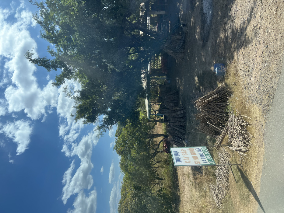 A rural scene shows piles of harvested crops, likely sugarcane, stacked alongside a dirt road. A sign in Vietnamese advertises the purchase of crops and supplies. A large tree provides shade. Overhead, a partly cloudy sky fills the upper portion of the image. A simple structure or shed is visible in the background. The image appears to be rotated slightly. The area looks dry and grassy.
