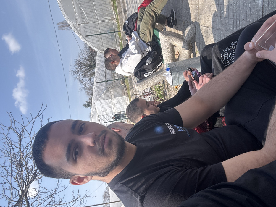 The image depicts an outdoor scene on a sunny day in Plovdiv, Bulgaria, featuring several young men resting on a decorative public bench with large commercial greenhouses in the background. The exact location within Plovdiv cannot be determined from the image, but the presence of greenhouses suggests an agricultural or peri-urban area. In the foreground, a male subject with short dark hair and a beard, wearing a black t-shirt and dark pants, faces the camera directly. He holds a clear plastic rectangle in his right hand. To his immediate left, another male's head is partially visible. Adjacent to the foreground subject, a third male, also with short hair, wears a black long-sleeved shirt and observes a mobile phone with a purple case. Further along the bench, a fourth male in a white hooded sweatshirt, olive-green pants, and black athletic shoes is seated. A black Adidas backpack containing a clear water bottle rests beside him on the bench. A fifth male is partially visible to his right, wearing a dark top. All seated individuals are observed in a relaxed posture. A galvanized bucket with a blue cap is positioned on the ground next to the bench. The background reveals multiple large, arched commercial greenhouses constructed with metal frames and translucent plastic sheeting. These structures are separated from the foreground by a low wire fence. Bare deciduous trees are scattered in the mid-ground. The sky is clear blue with sparse white clouds. A lone figure in dark attire stands near the greenhouses in the far background.