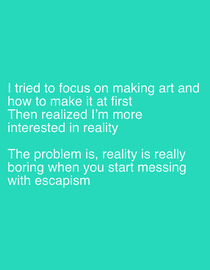 The image is a digital graphic presenting white sans-serif text against a solid teal background. The text reads: "I tried to focus on making art and how to make it at first Then realized I'm more interested in reality" followed by "The problem is, reality is really boring when you start messing with escapism." No discernible physical location, including Tel Aviv, Israel, nor any people, subjects, objects beyond the text, actions, or environmental details are depicted.