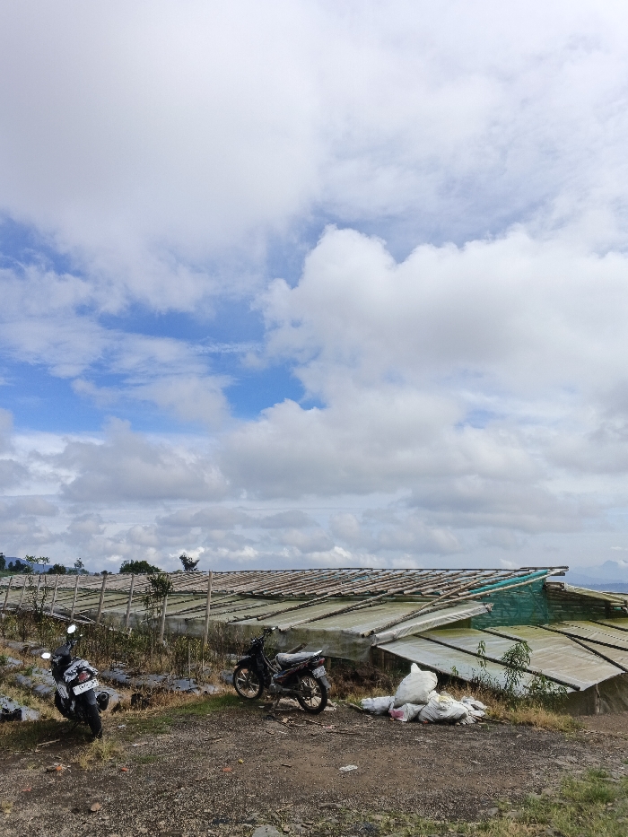 The photograph captures a rural scene with a cloudy blue sky overhead. In the foreground, two motorcycles are parked on a dirt ground. Beyond the motorcycles, a series of greenhouses or cultivation structures extend into the distance. These structures appear to be covered with translucent material, possibly plastic, and are supported by a grid of posts. Some scattered white bags rest nearby, suggesting agricultural activities in the area. The overall composition depicts a blend of transportation and agricultural landscape.