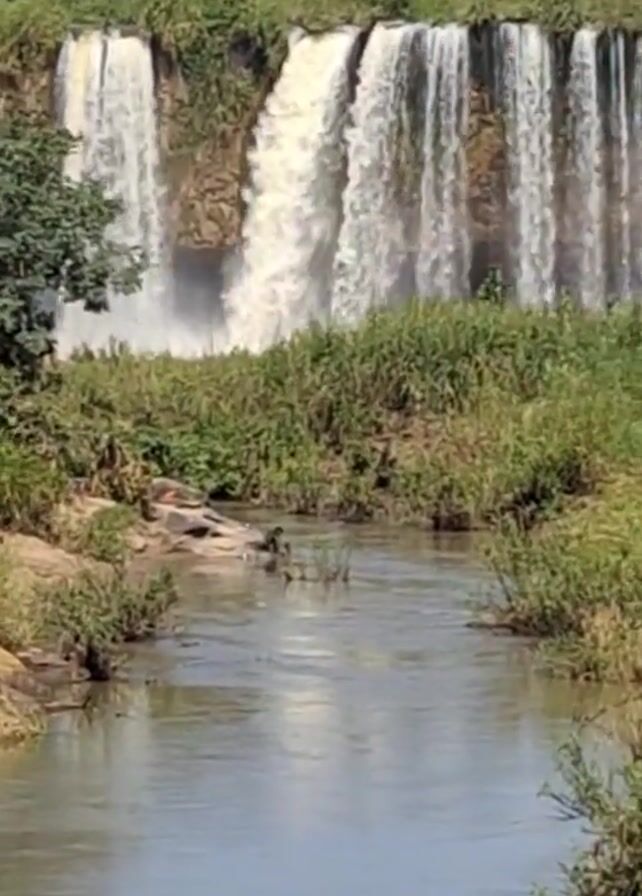 landscape scene with a wide river flowing towards a multi-tiered waterfall. Lush green vegetation and bushes surround the riverbanks and the top of the waterfall. A lone tree stands on the left side of the riverbank. The water cascades down the falls in a series of streams. The sky is bright and clear, suggesting a sunny day.