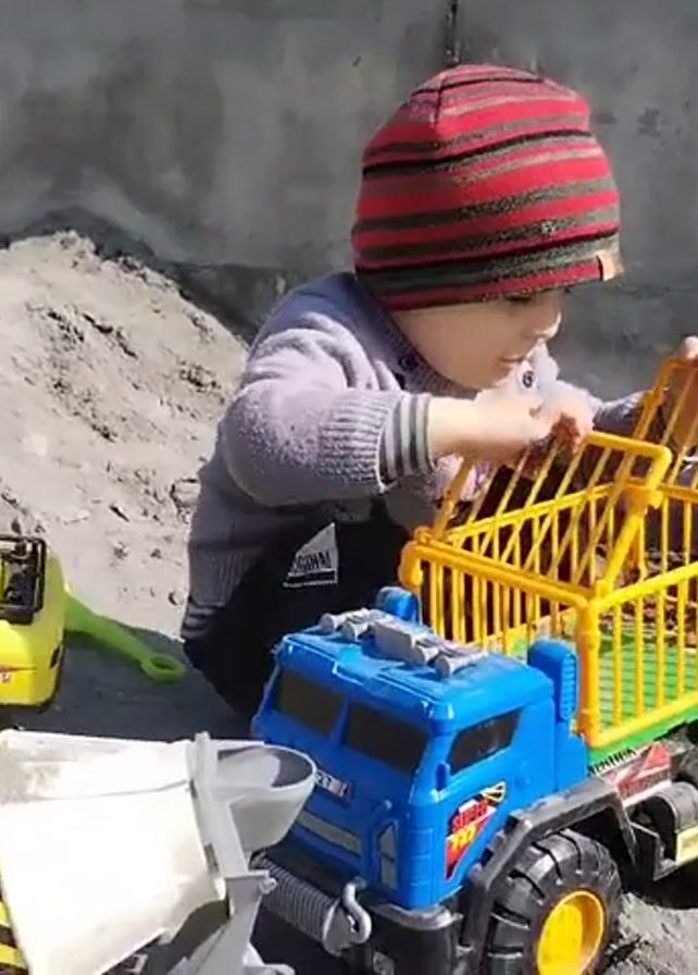 - "A young child wearing a red and black striped beanie is playing with toy trucks and construction vehicles in a sandbox-like area" by FM-F7Esh2, licensed under CC BY 4.0