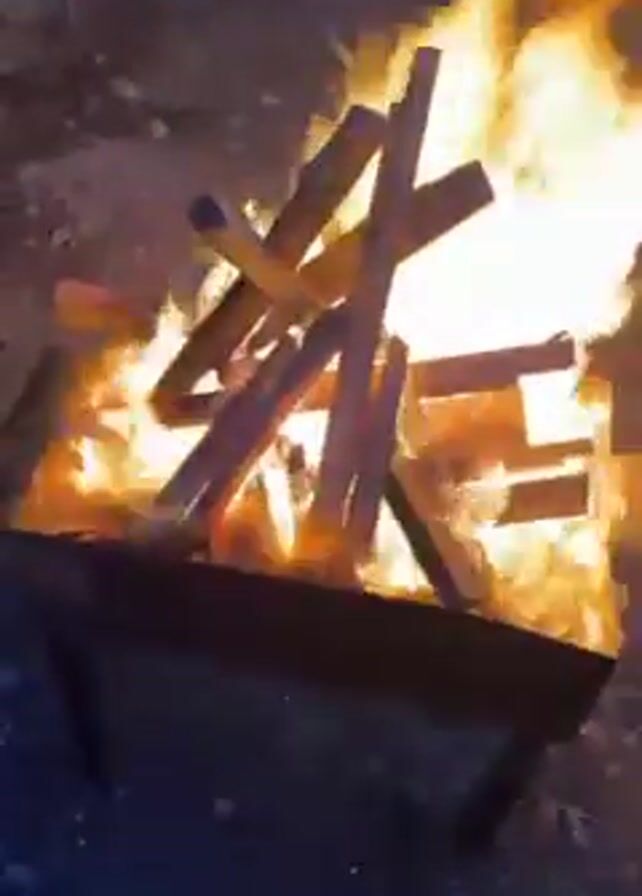 A metal fire pit full of burning wood is shown. The wood is stacked haphazardly and is engulfed in flames. The pit is on short legs and sits on a dark, rough surface, possibly gravel or dirt. The fire emits bright yellow and orange flames, and the light illuminates the surrounding area. Someone is speaking in the background.