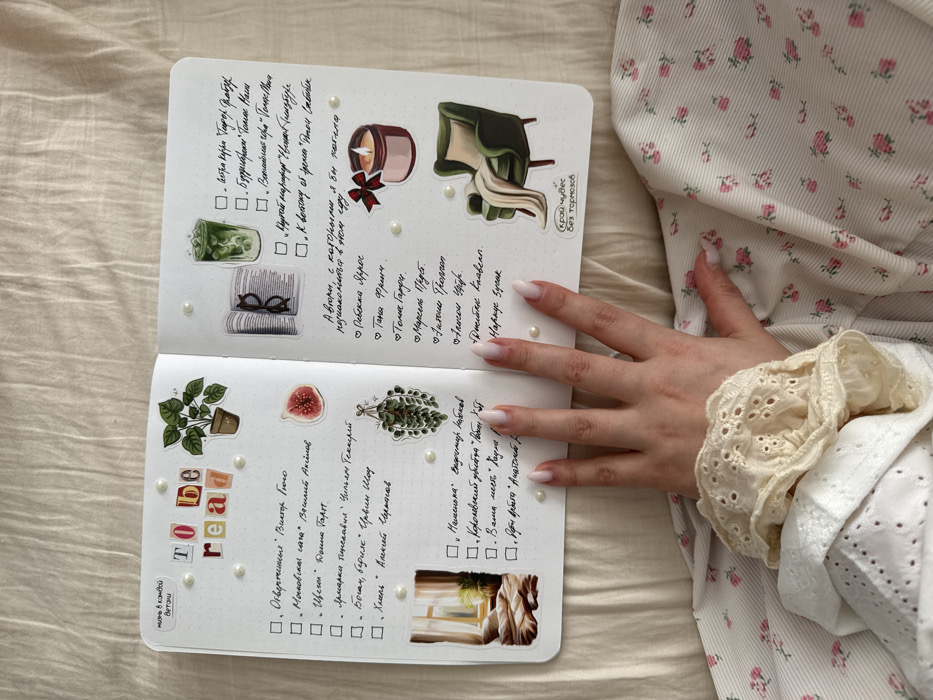 The image depicts an overhead view of an open white notebook resting on a light-colored, textured fabric surface, likely bedding. A light-skinned human hand with manicured, light-colored nails is positioned over the lower right page of the notebook. The hand emerges from a white sleeve with intricate eyelet lace and ruffles. Below and around the notebook, a striped fabric with small pink floral patterns is visible. The notebook, appearing to be a bullet journal, features dot-grid pages adorned with small white pearl stickers. Both pages contain handwritten Russian text and various pictorial stickers. The left page is titled "To be read" using stylized letter stickers. Below this, a Russian title "Жизнь в каждой ветви" is present. A checklist follows, listing several book titles and authors in Russian, including "Отверженные" by Виктор Гюго and "Московская сага" by Василий Аксенов. Stickers on this page include a potted plant, a halved fig, a hanging string of pearls plant, and a rectangular illustration of a sunlit window with a bed. Another checklist continues below the window sticker with more Russian titles. The right page features a Russian heading translated as "Authors I would like to get acquainted with this year," followed by a heart-iconed list of names such as Ребекка Яррос and Тони Гарро. A separate checklist at the top right contains more Russian book titles, including "К востоку от рая" by Джон Стейнбек. Stickers on this page include an open book with eyeglasses, a green iced drink, a pink candle with a red bow, and a green armchair with a beige throw blanket. A small sticker in the bottom right corner reads "Крой чудес Без тормозов" in Russian. The environment is an indoor setting. There are no visual indicators within the image to specify the location as Krasnodar, Russia.