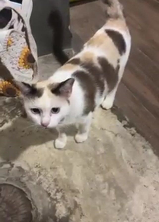 tan and white cat standing on a stone floor, looking up at the camera