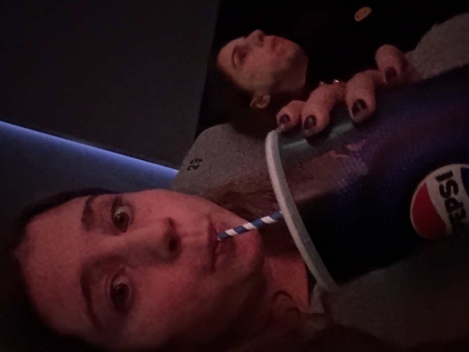 A selfie captures two people in dim lighting, one drinking from a large Pepsi cup with a blue and white striped straw